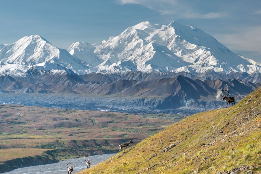 Majestic caribou bull in front of the mount Denali, ( mount Mckinley), Alaskal